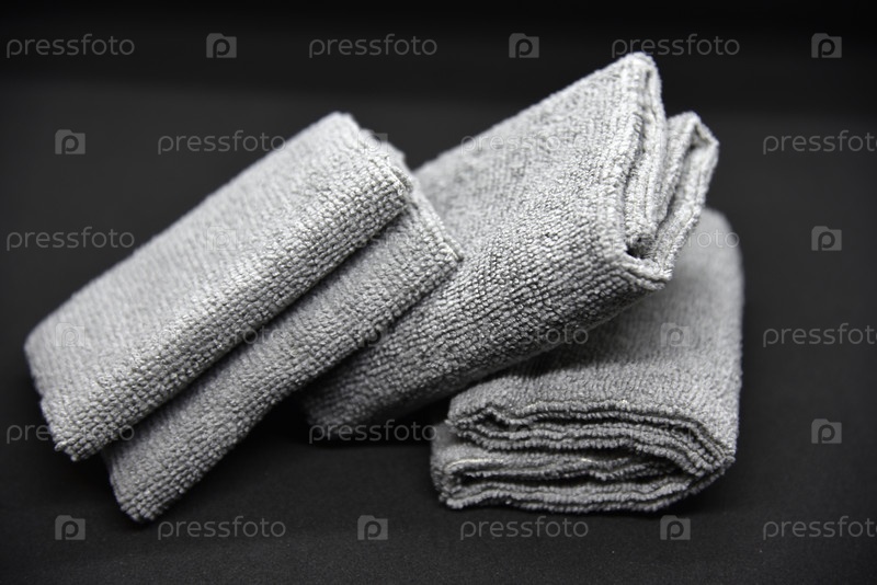 Три серых полотенца на черном фоне. Махровые салфетки для протирки мебели. Полотенца на черном фоне