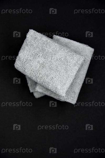 Три серых полотенца на черном фоне. Махровые салфетки для протирки мебели. Полотенца на черном фоне