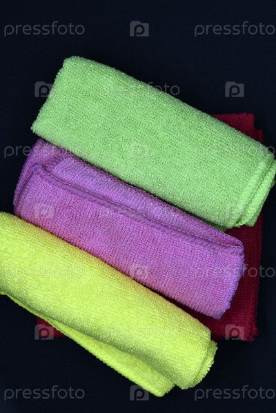 Разноцветные полотенца на черном фоне. Махровые полотенца. Цветные тряпки в рулонах. Свернутые тряпки