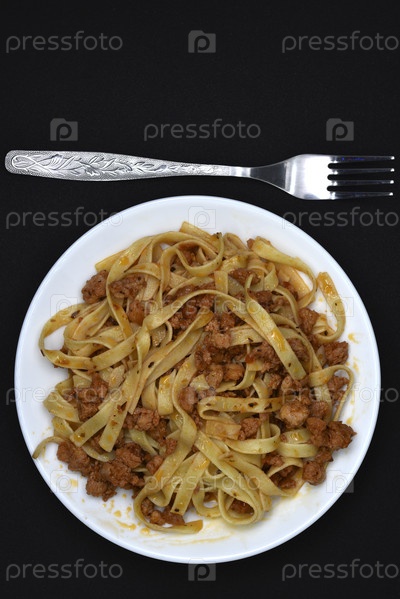 Итальянская паста на белой тарелке с вилкой. Тарелка вермишели с мясом на черном фоне