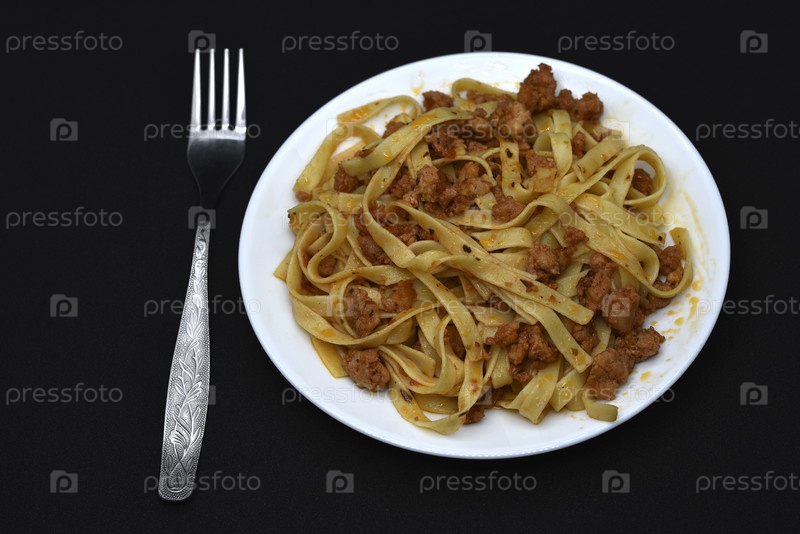 Итальянская паста на белой тарелке с вилкой. Тарелка вермишели с мясом на черном фоне