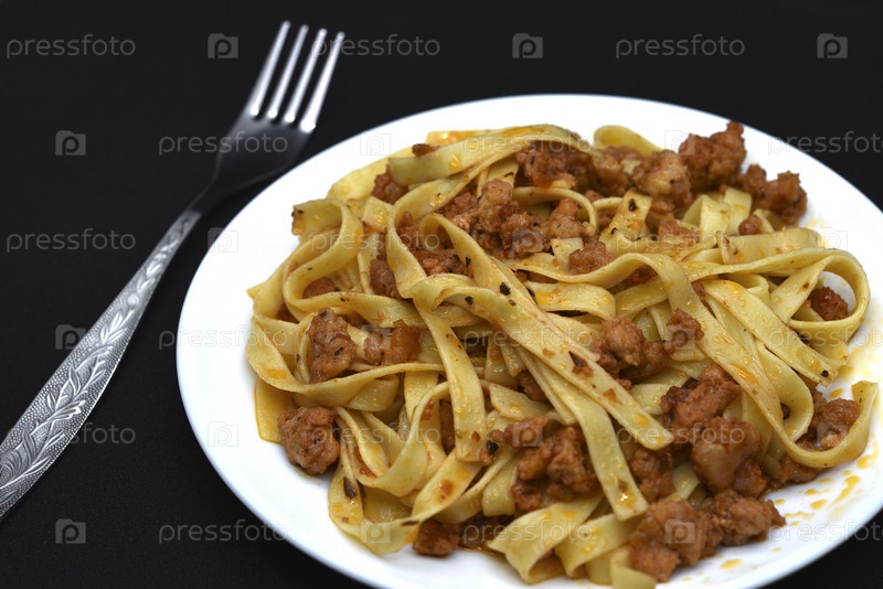 Итальянская паста на белой тарелке с вилкой. Тарелка вермишели с мясом на черном фоне