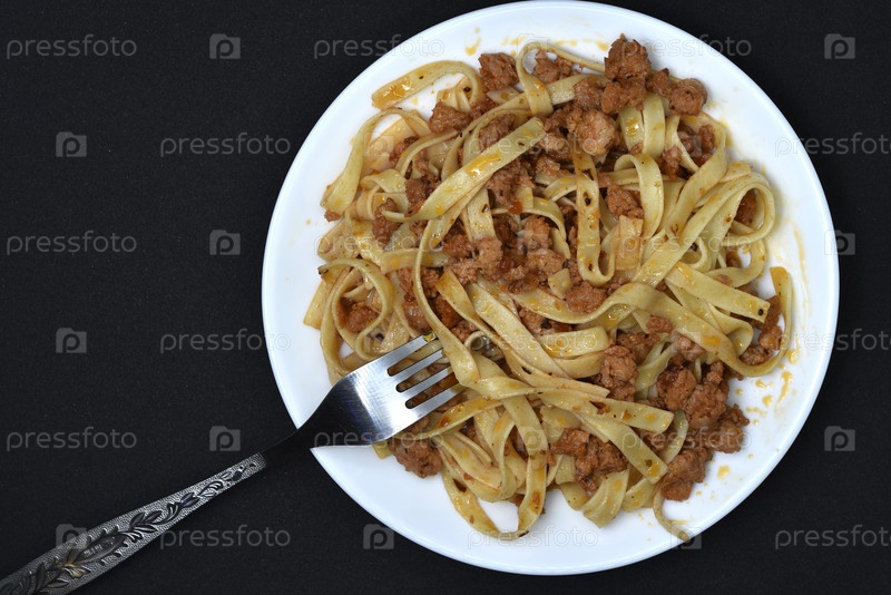 Итальянская паста на белой тарелке с вилкой. Тарелка вермишели с мясом на черном фоне