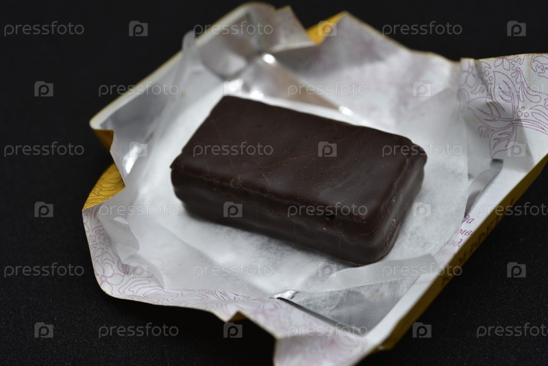 Шоколадные конфеты в упаковке на черном фоне. Сладкая конфета. Плитка шоколада в бумажной упаковке