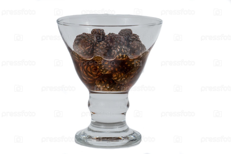 Стеклянная вазочка для варенья из сосновых шишек на белом фоне