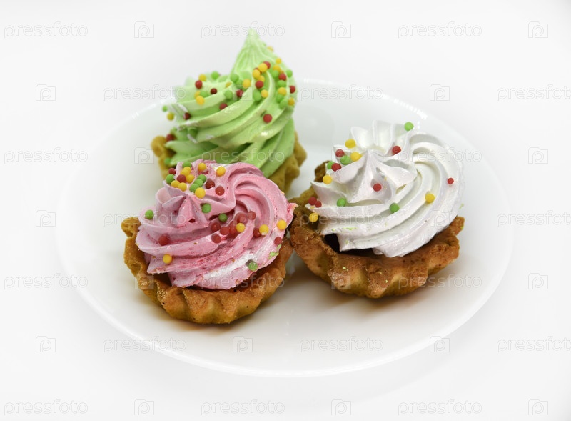 Вкусные красочные пирожные на тарелке. Пирожные с кремом на белом фоне. Песочные пирожные