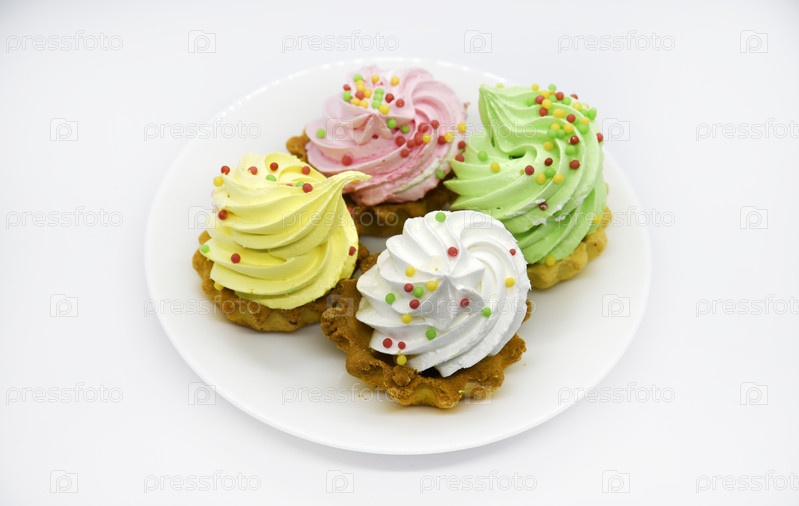 Вкусные красочные пирожные на тарелке. Пирожные с кремом на белом фоне. Песочные пирожные