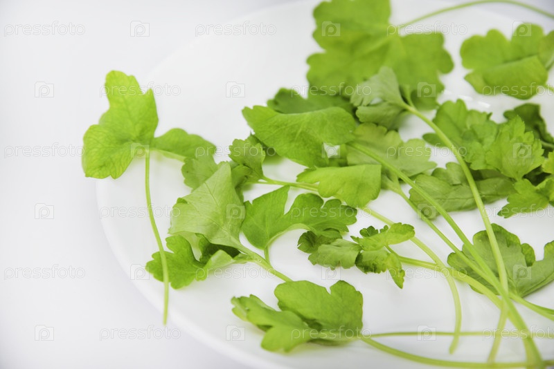 Зеленый свежий салат на белом фоне. Салат из свежей петрушки крупным планом. Зеленые листья салата