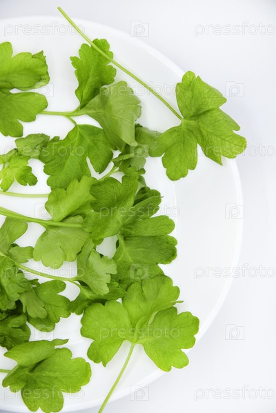 Зеленый свежий салат на белом фоне. Салат из свежей петрушки крупным планом. Зеленые листья салата