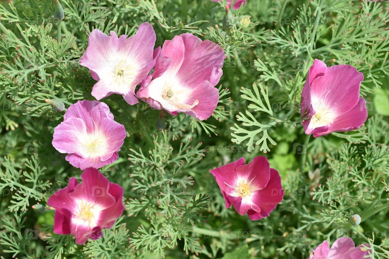 Синие цветы ашшольции на зеленом кусте днем. Красивые цветы ашшольции