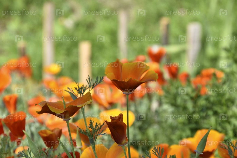 Красные и желтые цветы ашшольции на зеленом кусте днем. Красивые крупные цветы ашшольции. Фон цветов