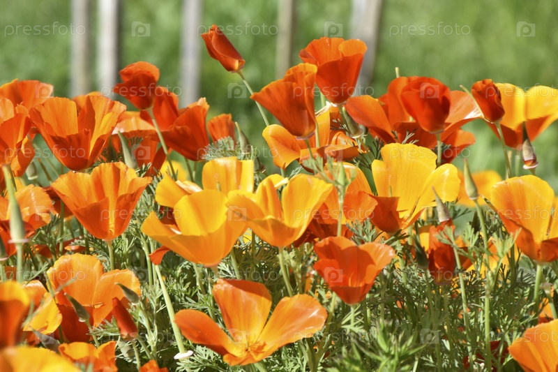 Красные и желтые цветы ашшольции на зеленом кусте днем. Красивые крупные цветы ашшольции. Фон цветов