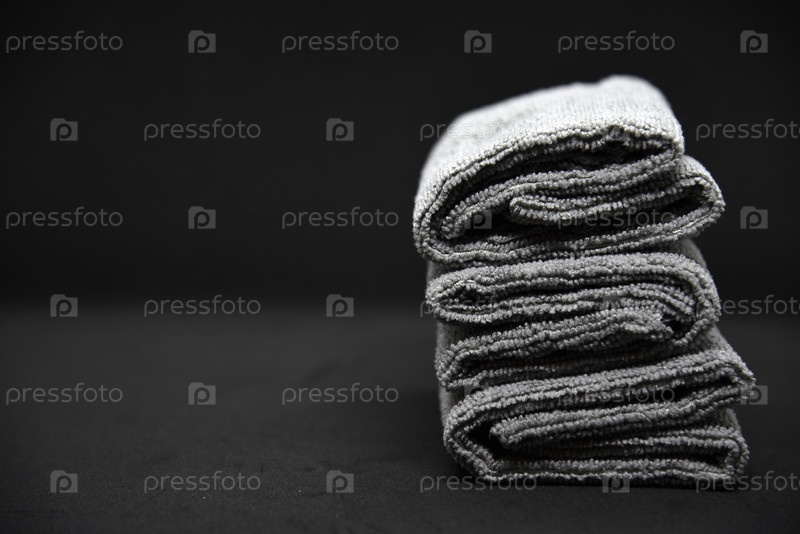 Три серых полотенца на черном фоне. Махровые салфетки для протирки мебели. Полотенца на черном фоне