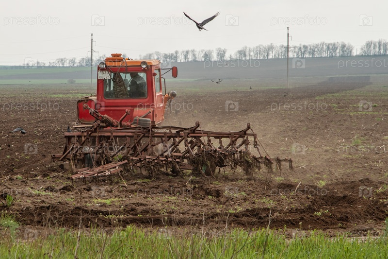 Старый гусеничный трактор работает в поле. Ворона летит над ним