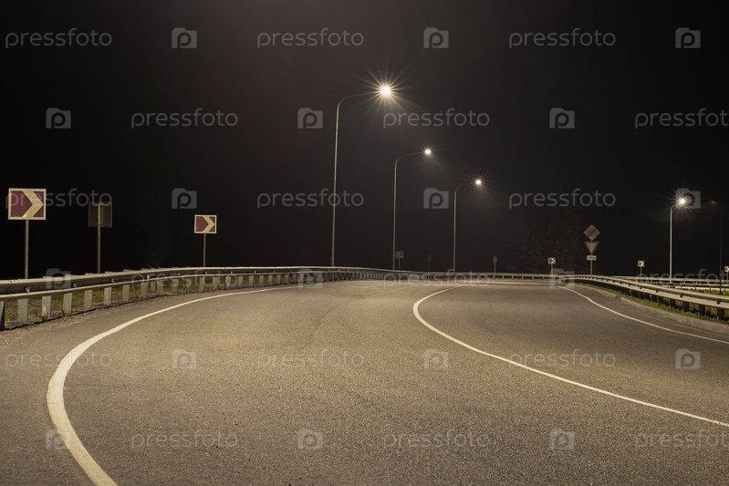 Поворот на пустой проселочной дороге, освещенной уличными фонарями