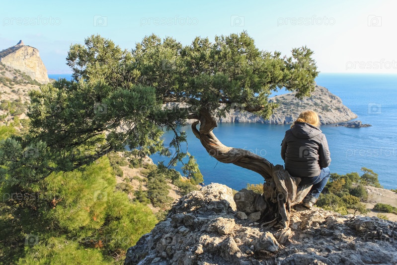 Девушка сидит на стволе можжевельника и смотрит на море. Дерево стоит на скале