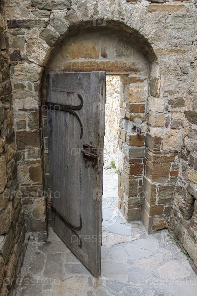 Старая деревянная открытая входная дверь в проеме с аркой в каменном замке