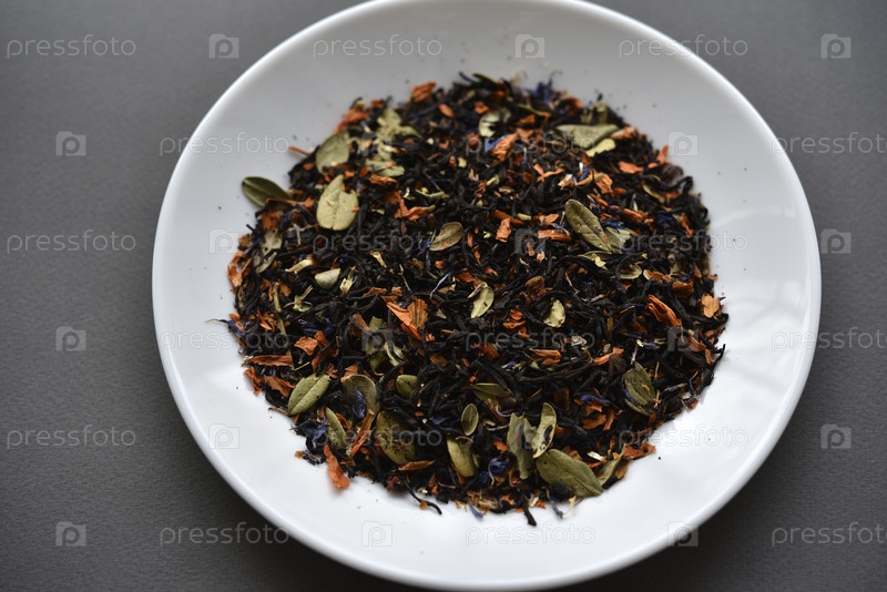 Черный чай на белой тарелке. Сухой чай со специями для заваривания