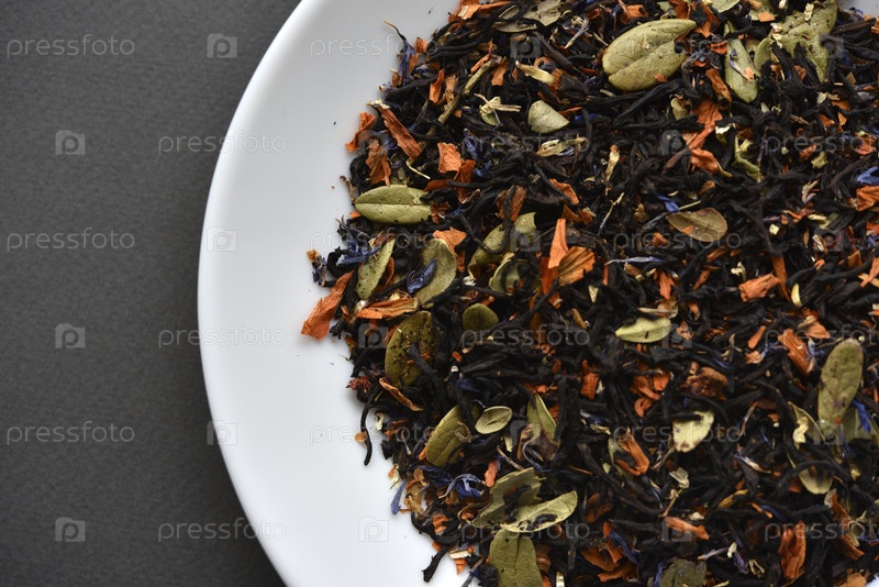 Черный чай на белой тарелке. Сухой чай со специями для заваривания