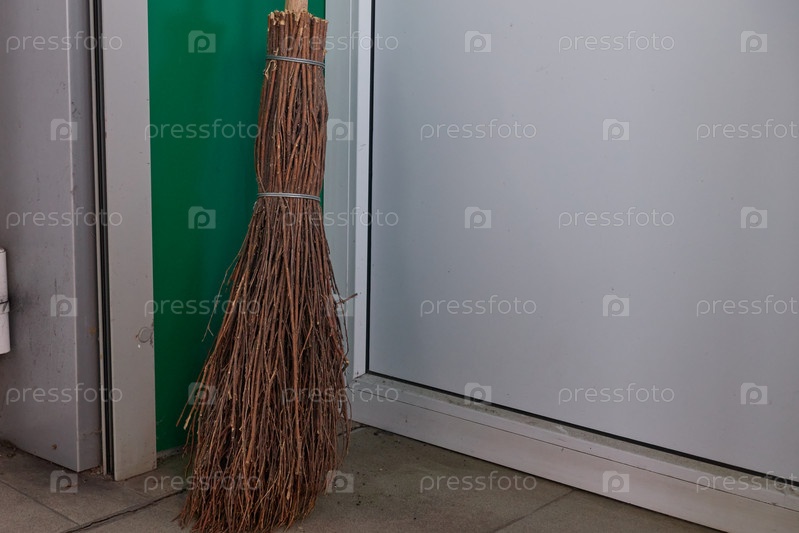 Метла из веток с деревянной ручкой стоит в углу комнаты
