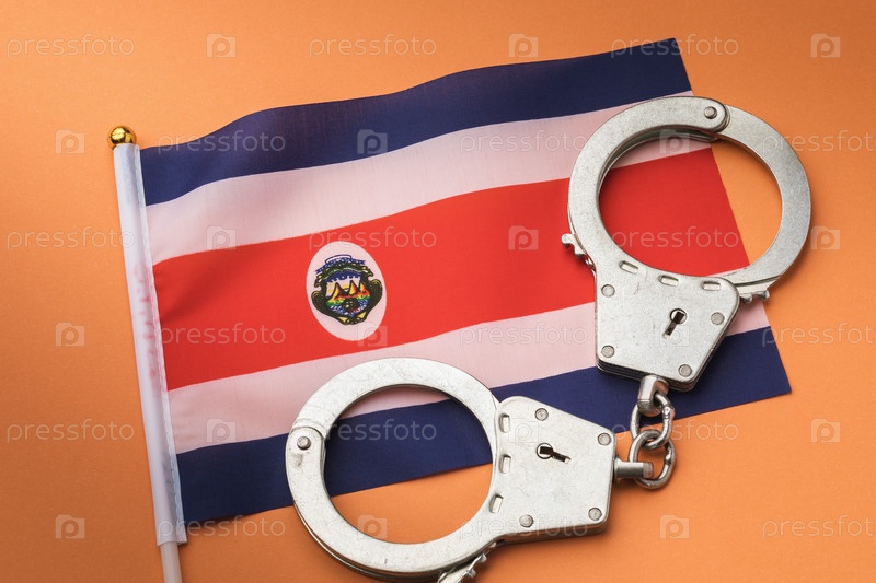 Флаг Коста-Рики и наручники на цветном фоне, концепция на тему преступности в Коста-Рике, вид сверху