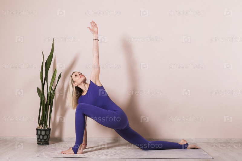 Привлекательная женщина, практикующая йогу, выполняет упражнения анджанеясаны, позу всадника, тренировку в синей спортивной одежде