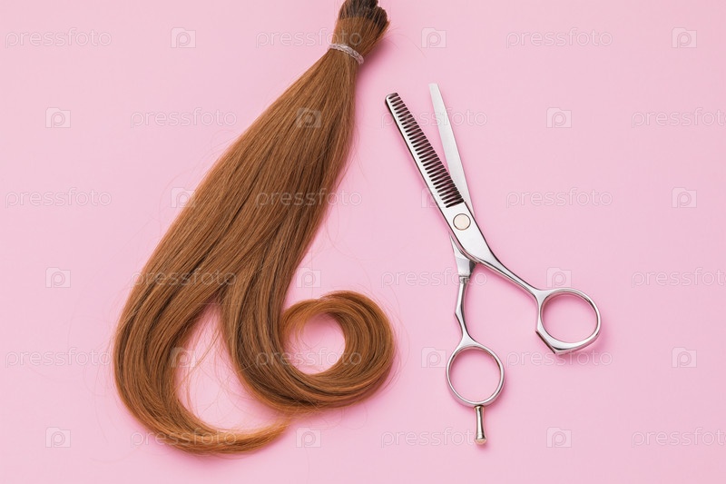 Отрезанная прядь женских детских волос светло-коричневого цвета и ножницы на розовом фоне, вид сверху. Парикмахерские услуги
