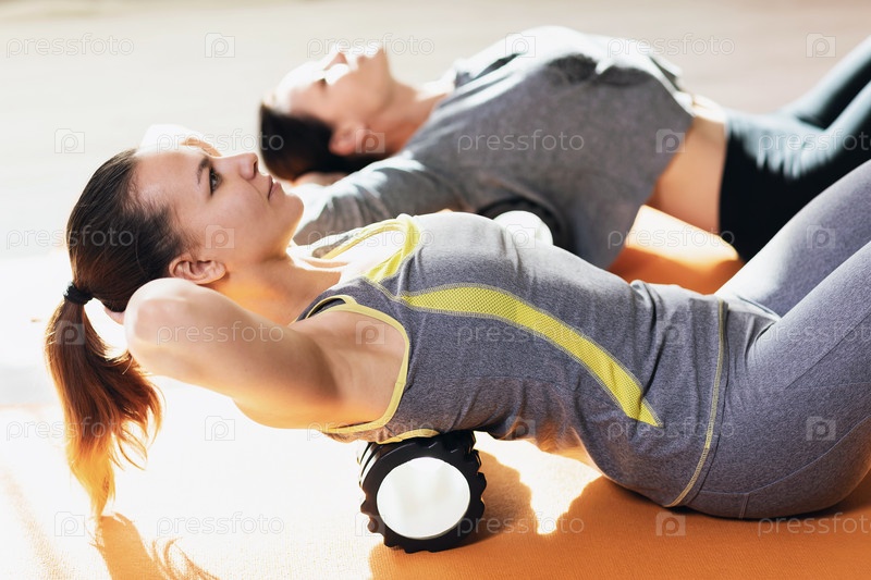 Две женщины в спортивной одежде, ведущие здоровый образ жизни, на гимнастических матах выполняют миофасциальную релаксацию мышц спины с помощью массажного ролика