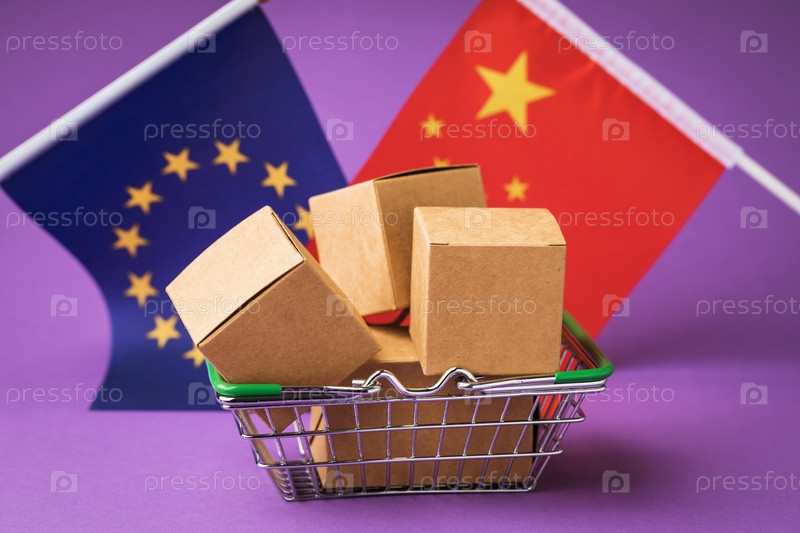 Картонные коробки в продовольственной корзине, флаги Китая и Европейского союза на цветном фоне, концепция торговли между странами