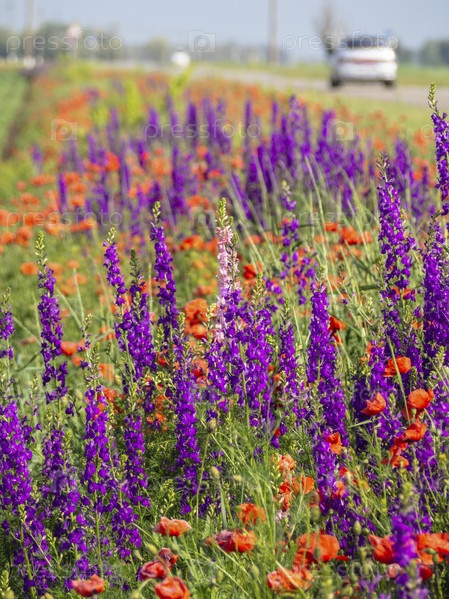 Красочный весенний цветочный луг возле дороги, по которой ездят автомобили. Цветы фиолетовых люпинов и красных маков на весеннем фоне