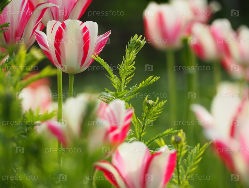 Фоновая цветочная текстура. Цветущие бело-красные цветы тюльпаны в зеленой траве в саду. Весенний или летний естественный фон