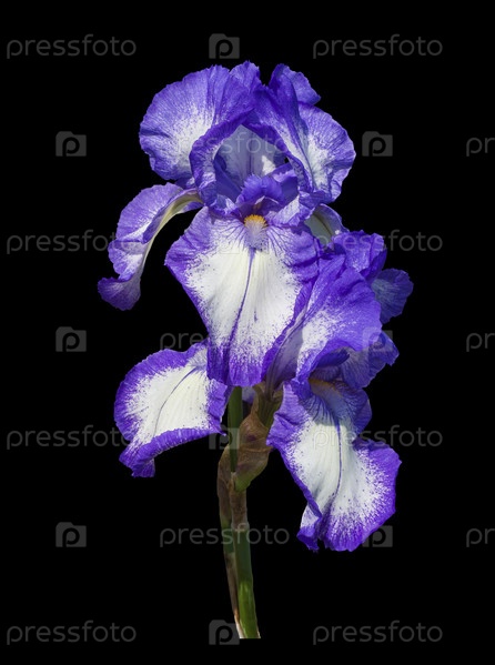 Красивый бело-фиолетовый цветок ириса, сложенный. Фиолетовый цветок ириса на черном фоне