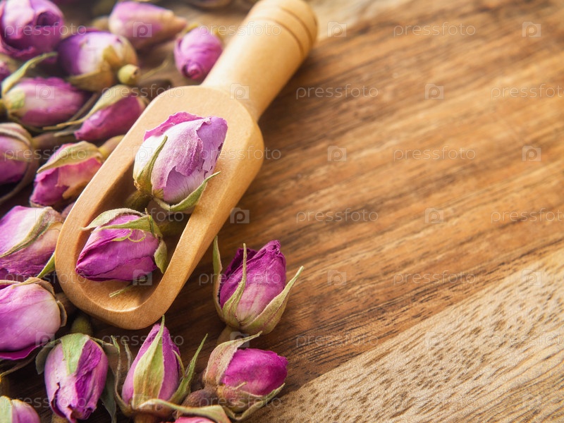 Розовые высушенные бутоны роз для приготовления чая на деревянном столе и в чашке крупным планом. Теплые тона. Горизонтальный. копирайт. Выборочный фокус