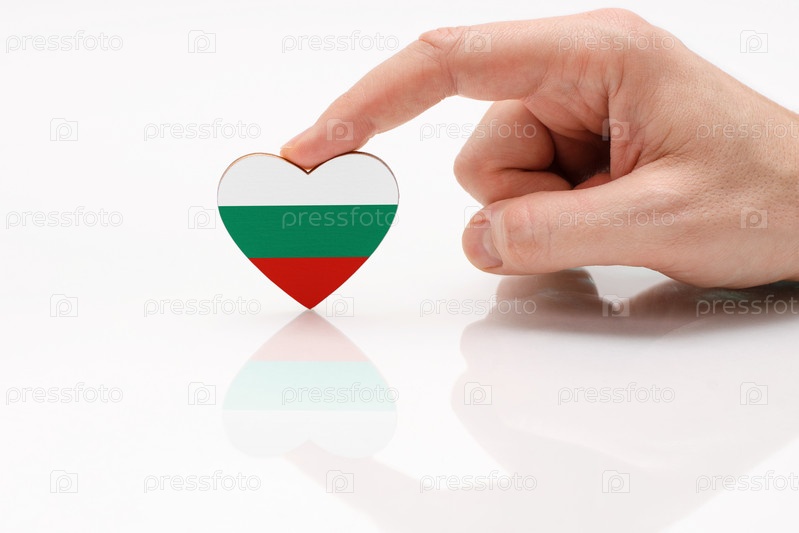 Любите и уважайте Болгарию. Мужская рука держит сердце в форме флага Болгарии на поверхности белого стекла. Концепция болгарского патриотизма и гордости