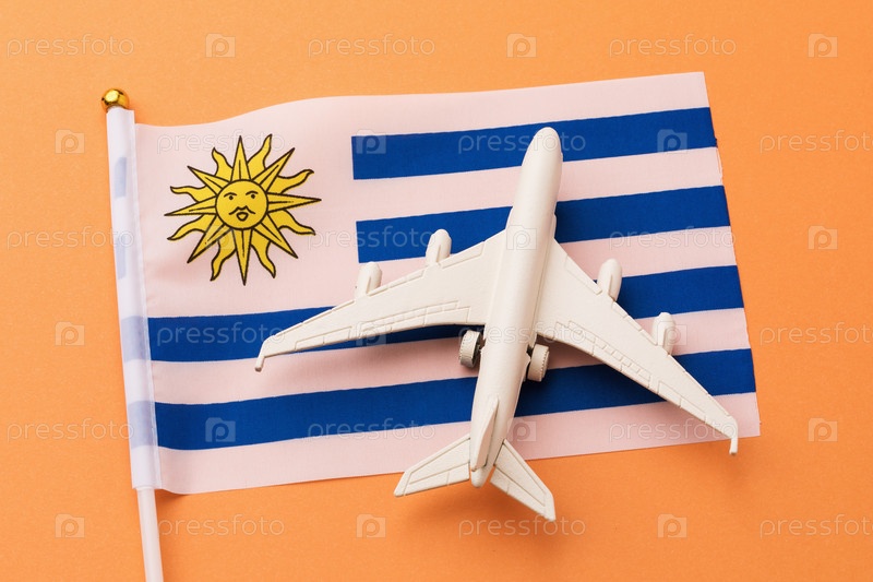 Флаг Уругвая и игрушечный самолет на оранжевом фоне, концепция полета по стране, вид сверху