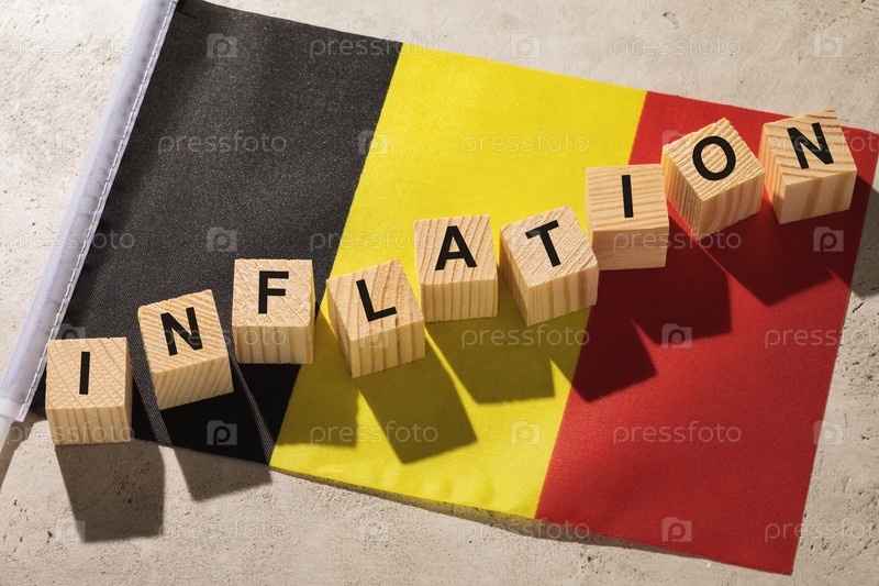 Бельгийский флаг и деревянные кубики с текстом, концепция на тему инфляции в Бельгии