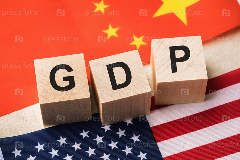 Деревянные кубики с текстом на фоне флагов Китая и Америки, концепция на тему сравнения ВВП США и Китая