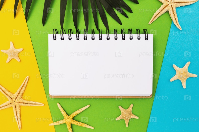 Пустой блокнот на цветном фоне в окружении морских звезд