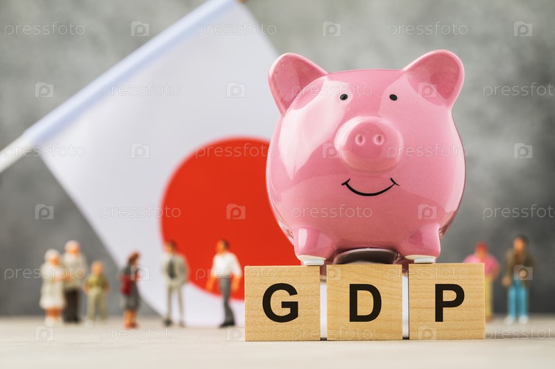 Копилка, деревянные кубики с текстом, игрушечные человечки из пластика и флаг на абстрактном фоне, концепция на тему ВВП в Японии