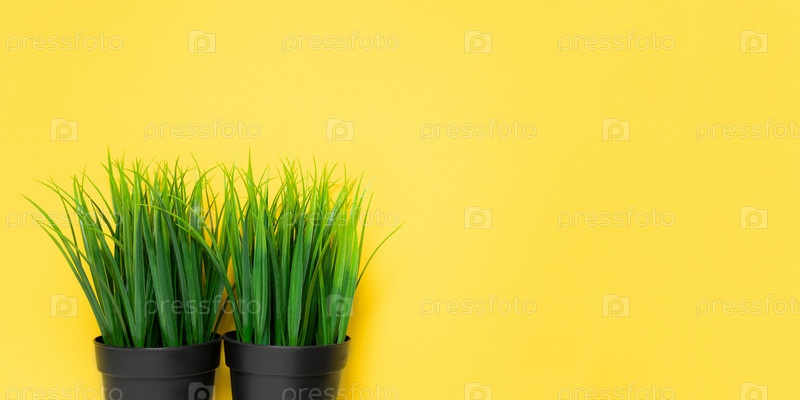 Зеленая декоративная трава в двух черных цветочных горшках на желтом фоне. Место для текста, баннер