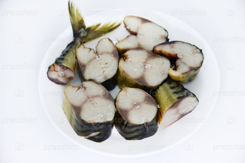 Рыба холодного копчения на белой тарелке. Вкусная селедка. Копченая сельдь