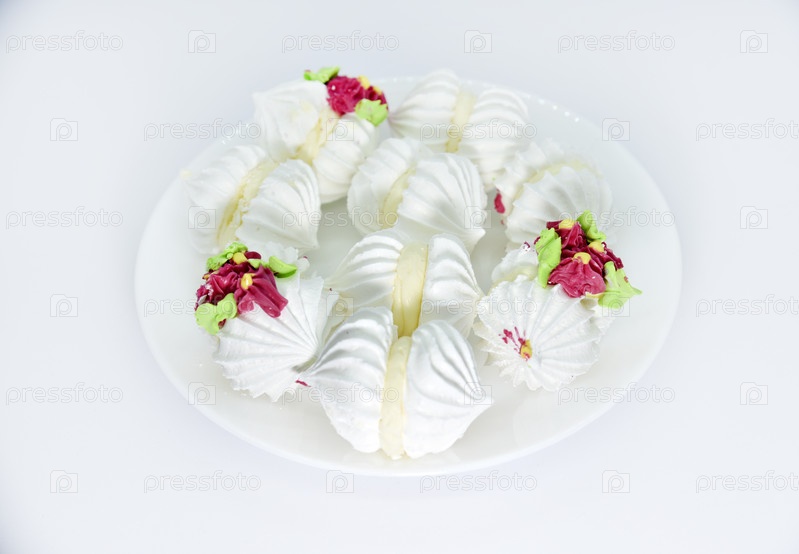 Вкусный зефир бизе на белой тарелке. Сладкая закуска. Зефир к чаю