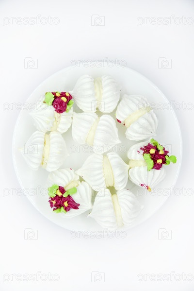 Вкусный зефир бизе на белой тарелке. Сладкая закуска. Зефир к чаю