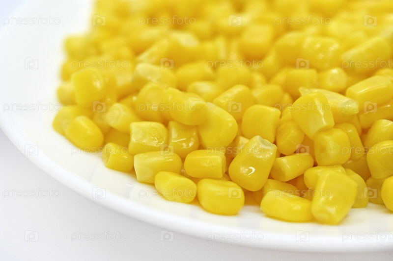 Консервированная кукуруза крупным планом на белой тарелке. Зерна желтой вкусной сочной кукурузы. Фон кукурузных зерен на белом фоне