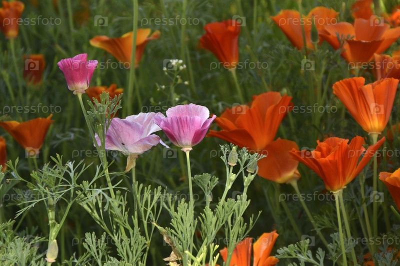 Синие цветы ашшольции на зеленом кусте днем. Красивые цветы ашшольции