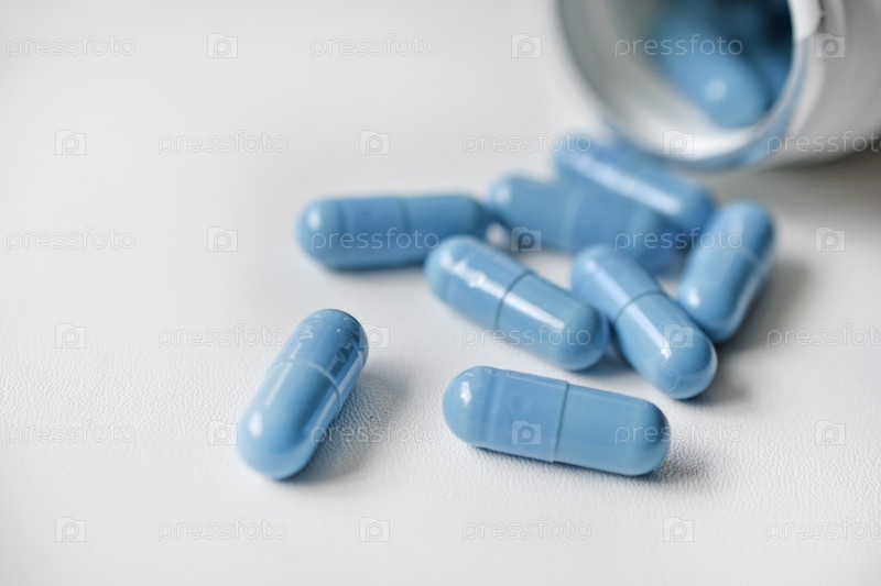Синие капсулы с лекарством на белом фоне. Лекарство вылилось из баночки. Капсулы