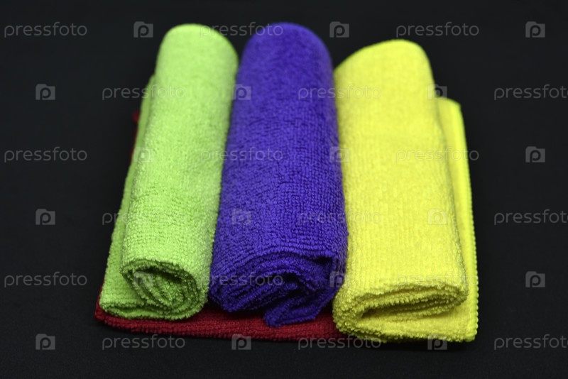 Разноцветные полотенца на черном фоне. Махровые полотенца. Цветные тряпки в рулонах. Свернутые тряпки