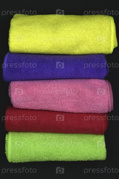 Разноцветные полотенца на черном фоне. Махровые полотенца. Цветные тряпки в рулонах. Свернутые тряпки