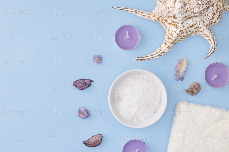 Морская косметическая соль для красоты с эфирными маслами, экстрактом цветов, для ухода за кожей на синем фоне рядом с ароматными свечами, цветочными бутонами и ракушкой на синем фоне. Копировать пространство