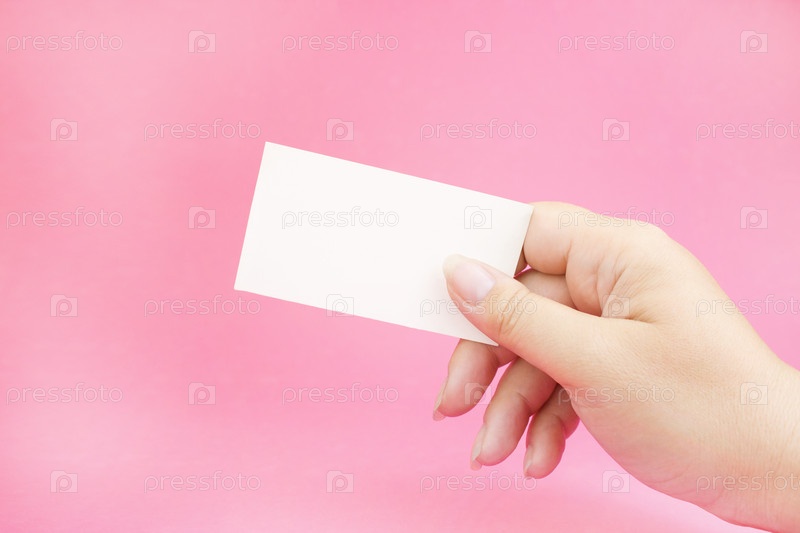 Белый лист визитной карточки в руке на розовом фоне. Рука держит визитную карточку. Бизнес-концепция